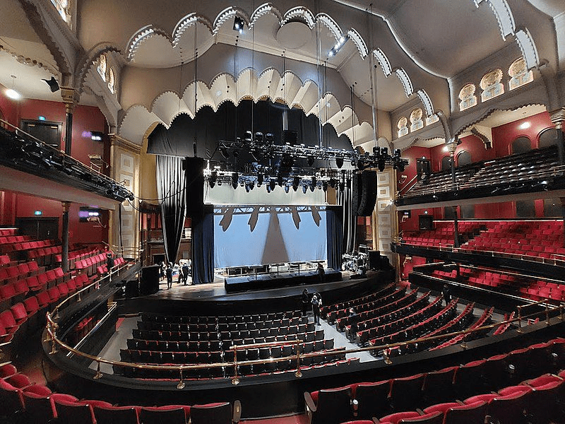 The ceiling, once obscured by a wire mesh, was fully restored and made visible to the audience. Original brass railings were retained, and new seating was designed to match the originals.